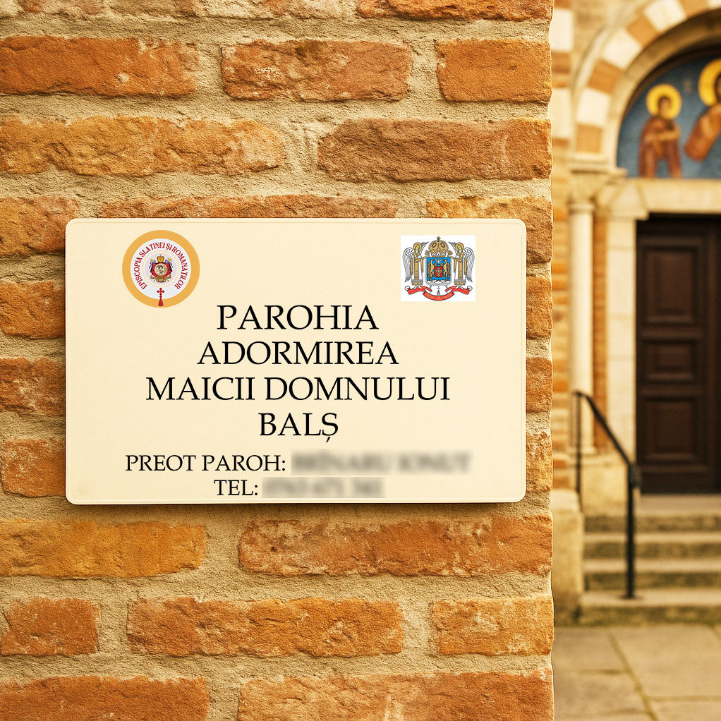 Plăci informative pentru biserică printate uv pe aluminiu (bond) și lăcuite pentru protecție suplimentară.